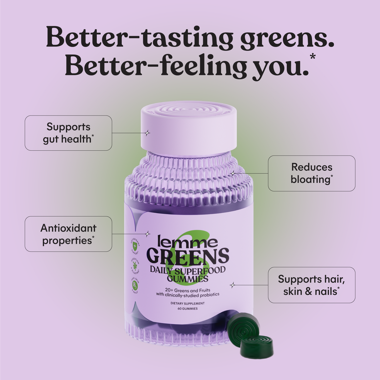 Lemme Greens is formulated with clinically-studied probiotic MTCC 5724, shown to support digestive health, help balance gut flora, and combat bloating.* Additionally, these gummies are made with our Organic Greens Superfood Complex and our Superfruit Antioxidant Support Complex with 20+ fruits and vegetables to support overall wellness from within.*