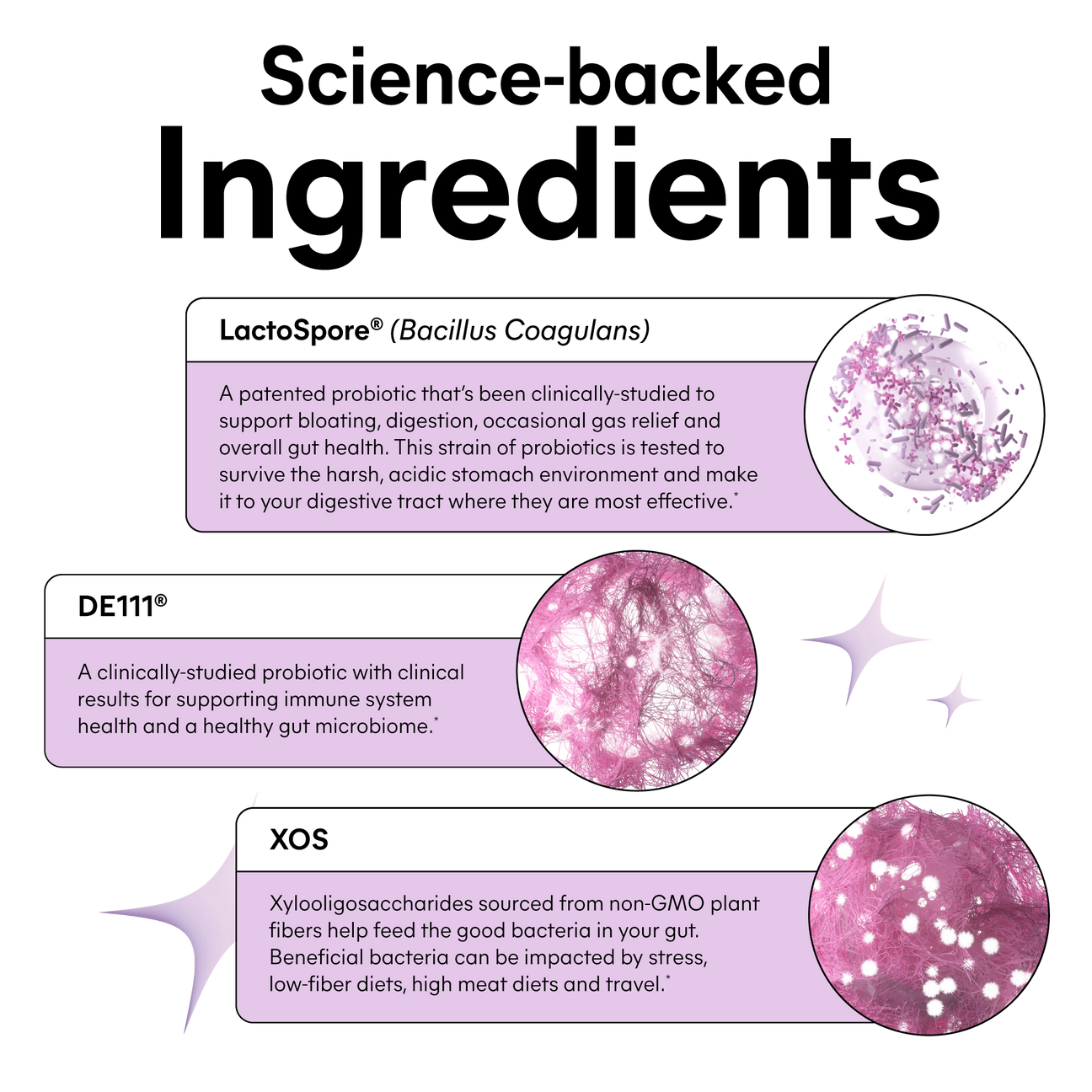 A patented probiotic strain shown to support bloating, digestion, occasional gas relief and overall gut health. This strain of probiotics is tested to survive the harsh, acidic stomach environment and make it to your digestive tract where they are most effective.*