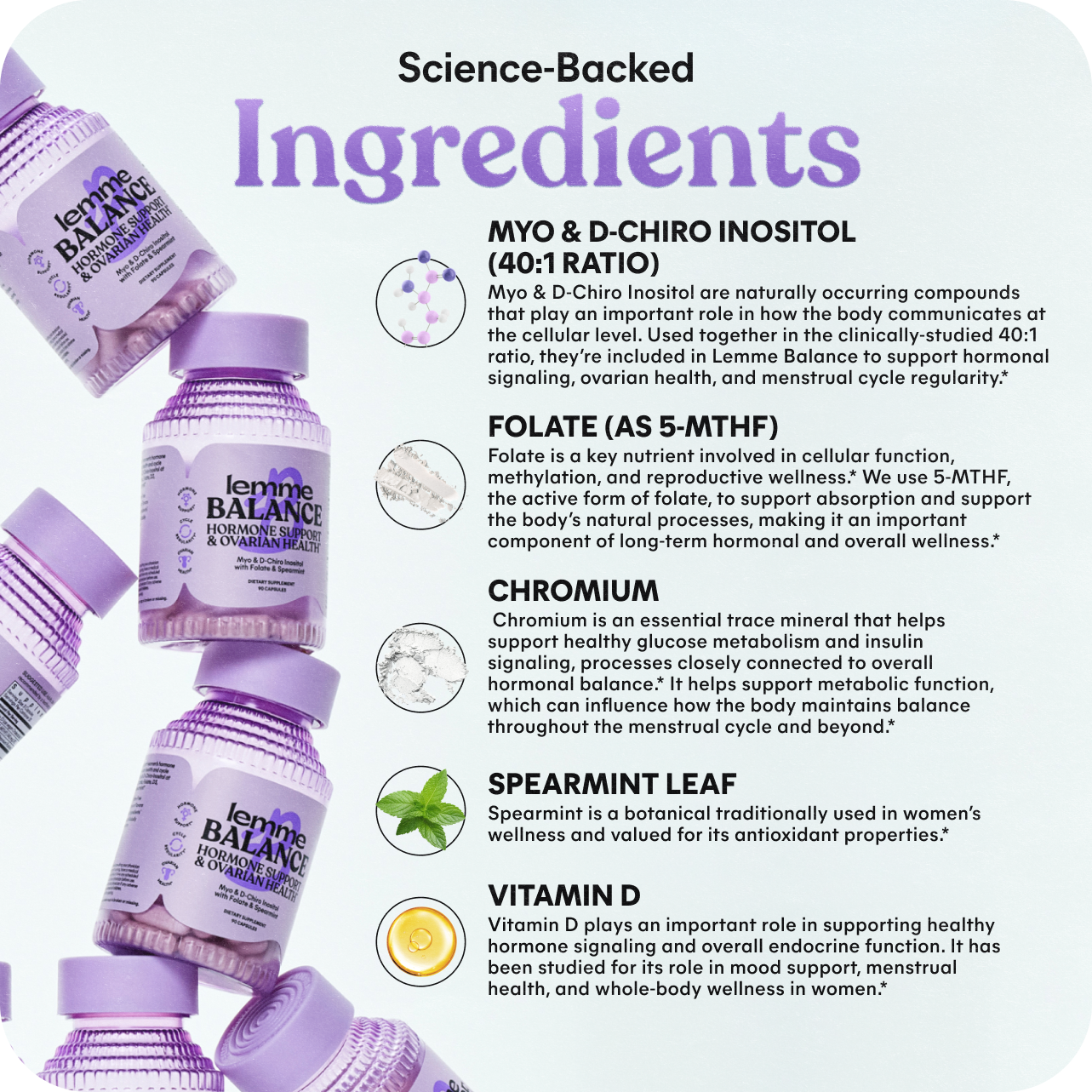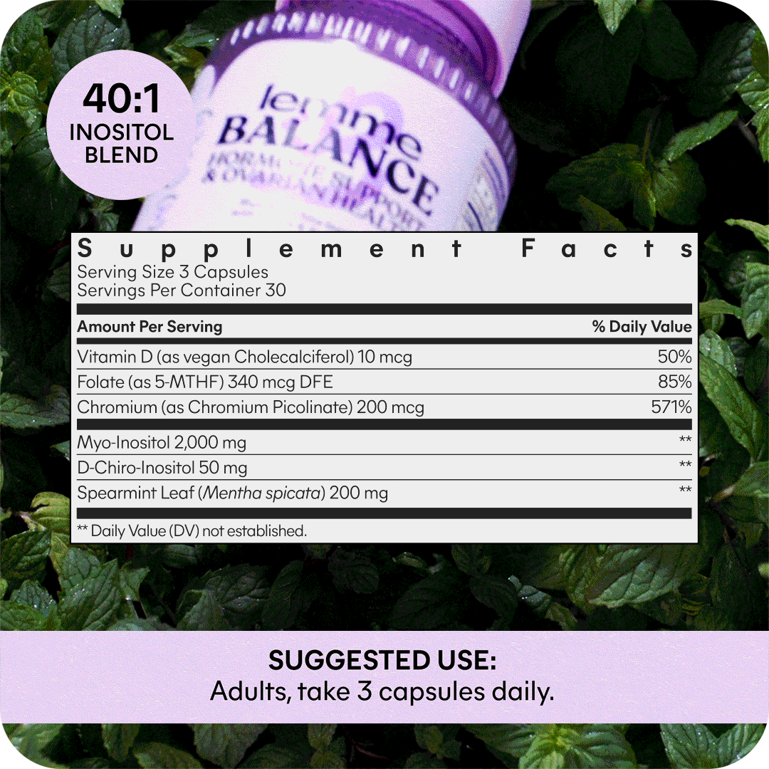 Hormone balance, backed by science: Lemme Balance is a science-backed blend of Myo & D-Chiro Inositol, Folate, Vitamin D3, Chromium, and Spearmint. Formulated to support women's hormone management, ovarian health, and cycle regularity.*