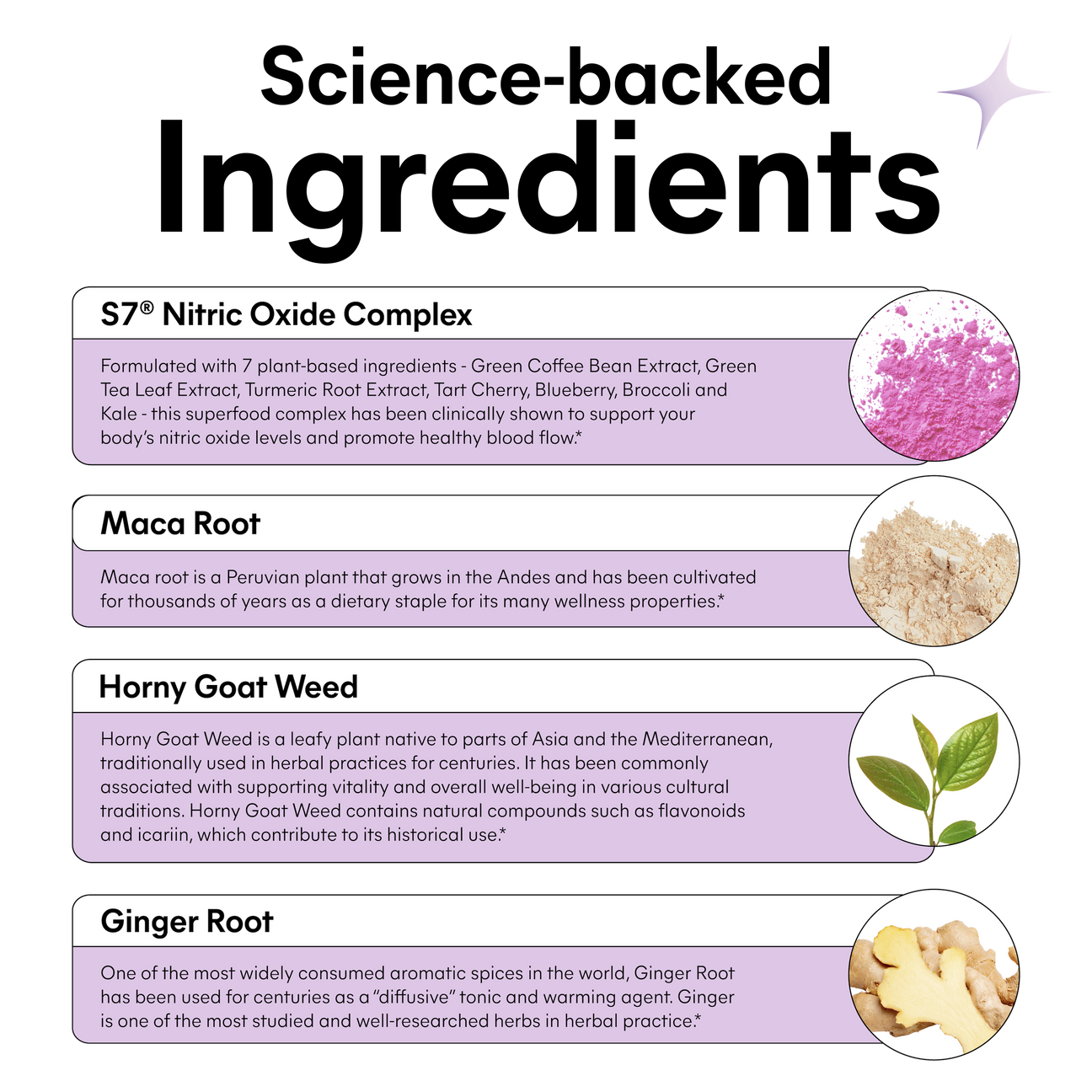 Support nitric oxide levels and promote healthy blood flow with clinically-studied S7® Complex. Formulated with Horny Goat Weed, Maca Root and Organic Ginger Root.*