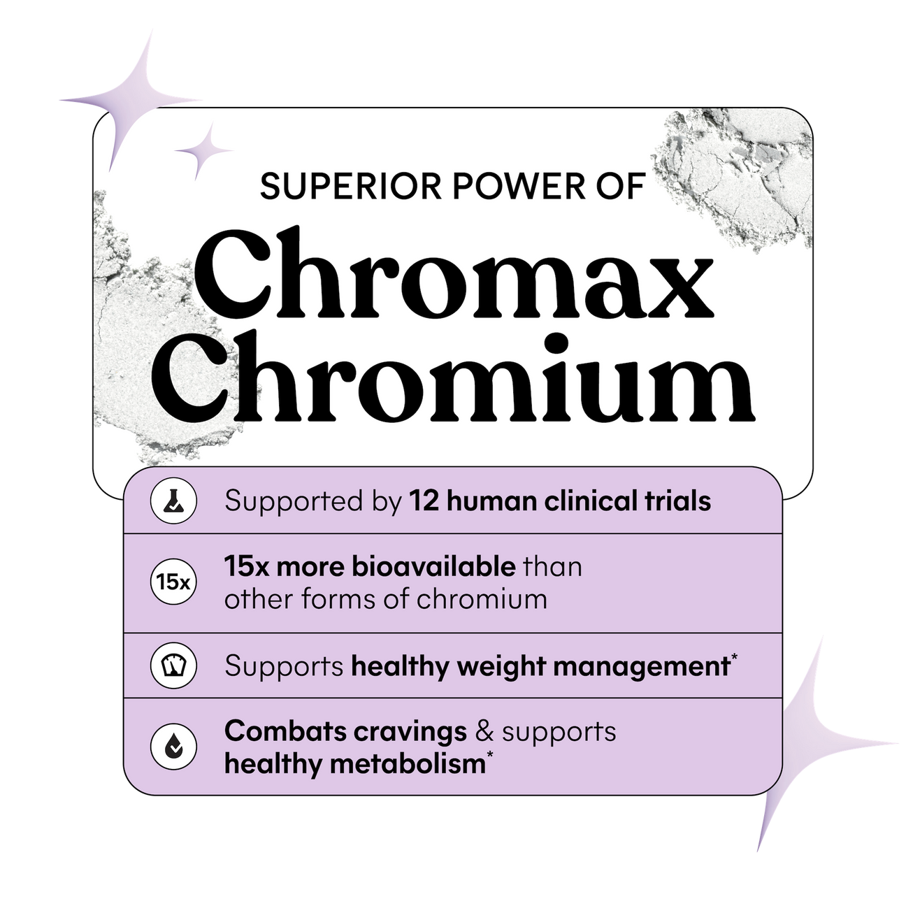 Chromax® Chromium Picolinate is a highly bioavailable form of Chromium supported by 12 human clinical studies shown to support glucose metabolism, insulin function, cravings support, body composition, mood and more.* Chromax has over 30 patents and pending applications worldwide.
