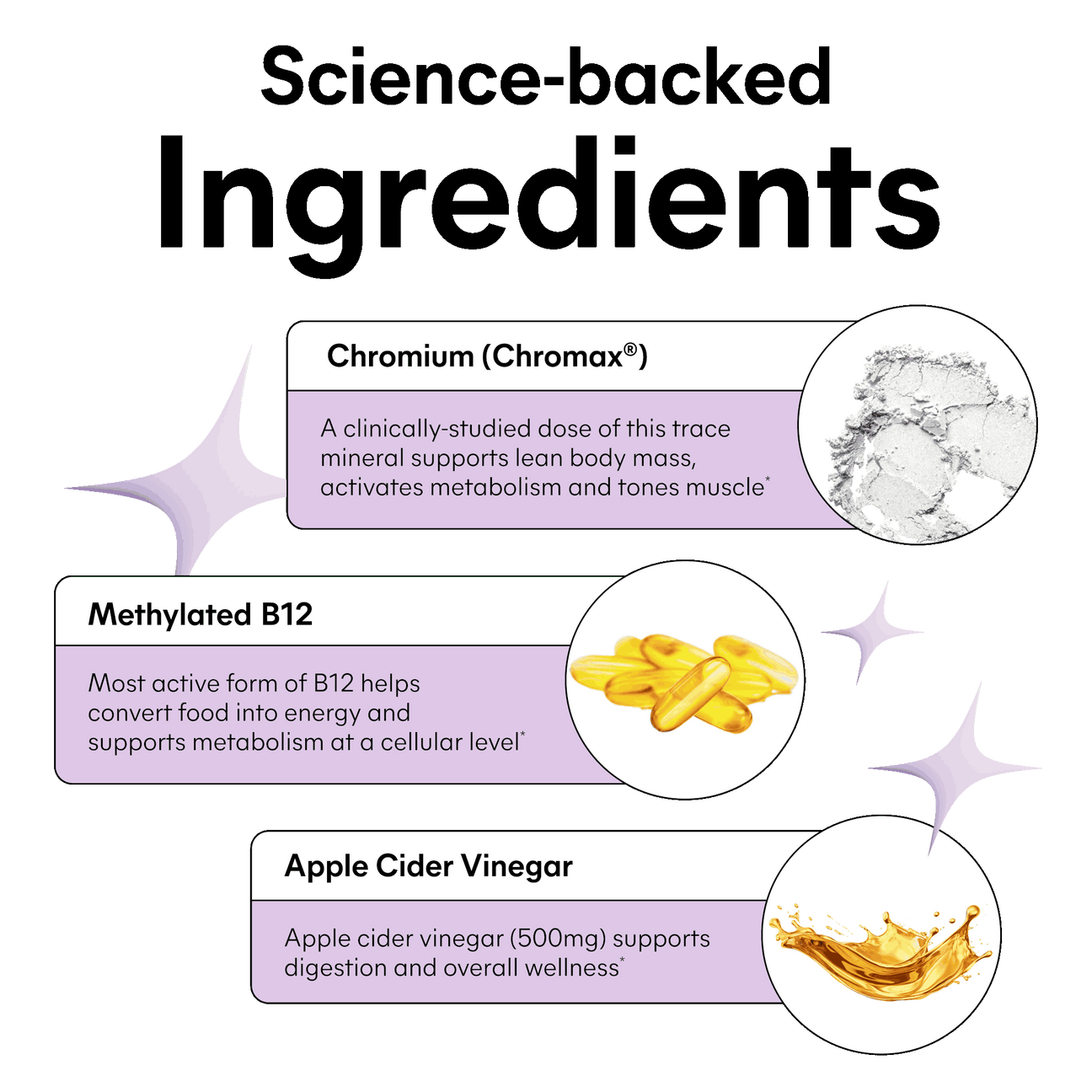 Lemme Tone is formulated with clinically-studied Chromax® Chromium Picolinate, shown in human clinical studies to support lean muscle mass, appetite regulation, healthy metabolism and healthy body composition in combination with diet and exercise.*