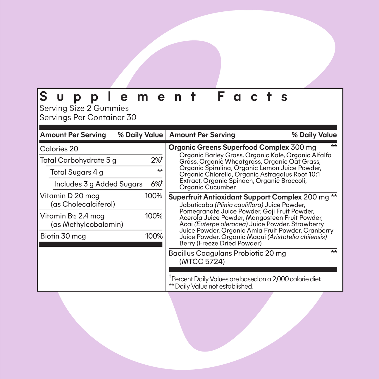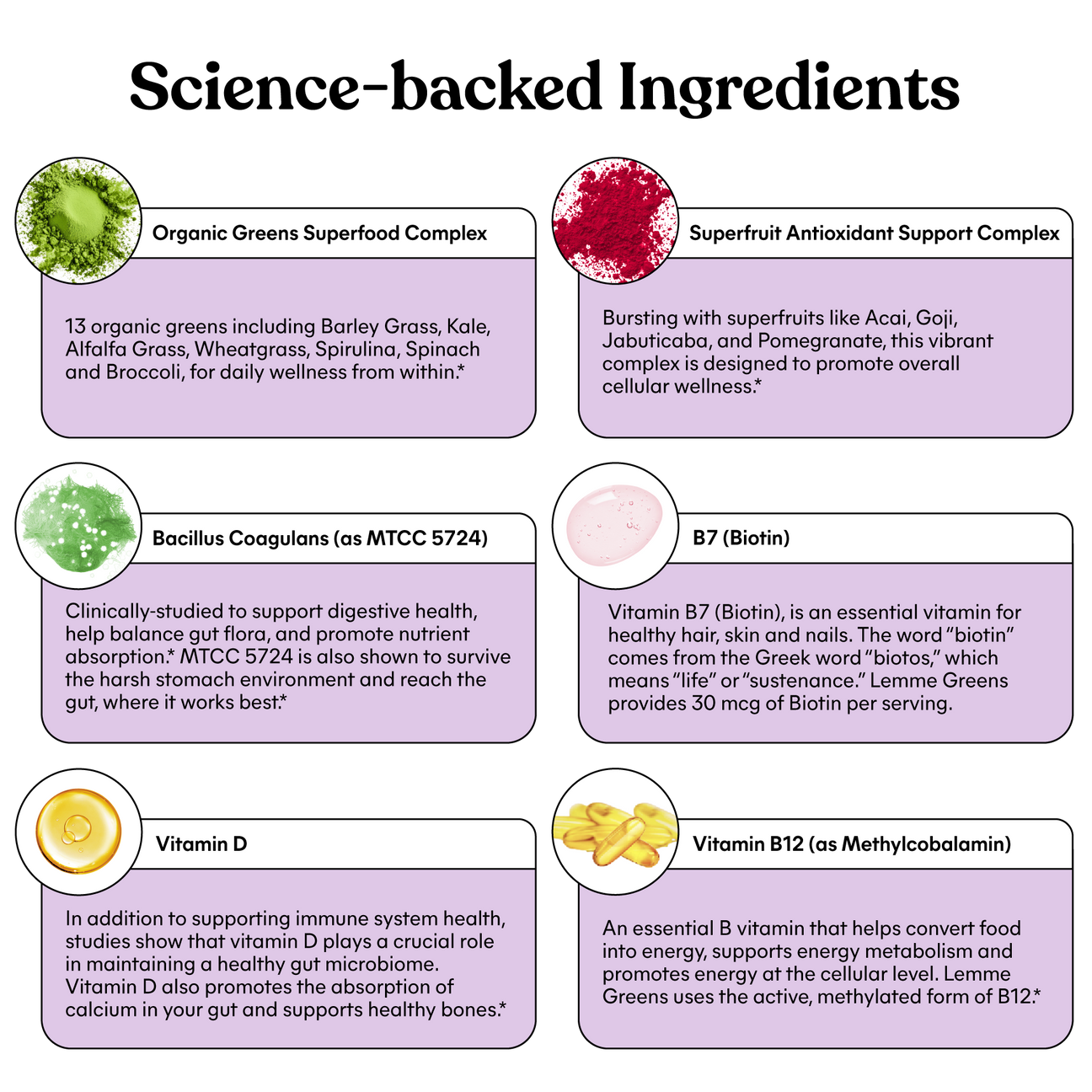 Formulated with 20+ greens and superfruits, Vitamin D3 and Methylated B12 for daily wellness. Plus clinically-studied probiotics support gut health, combat bloating and promote a healthy gut microbiome.*
