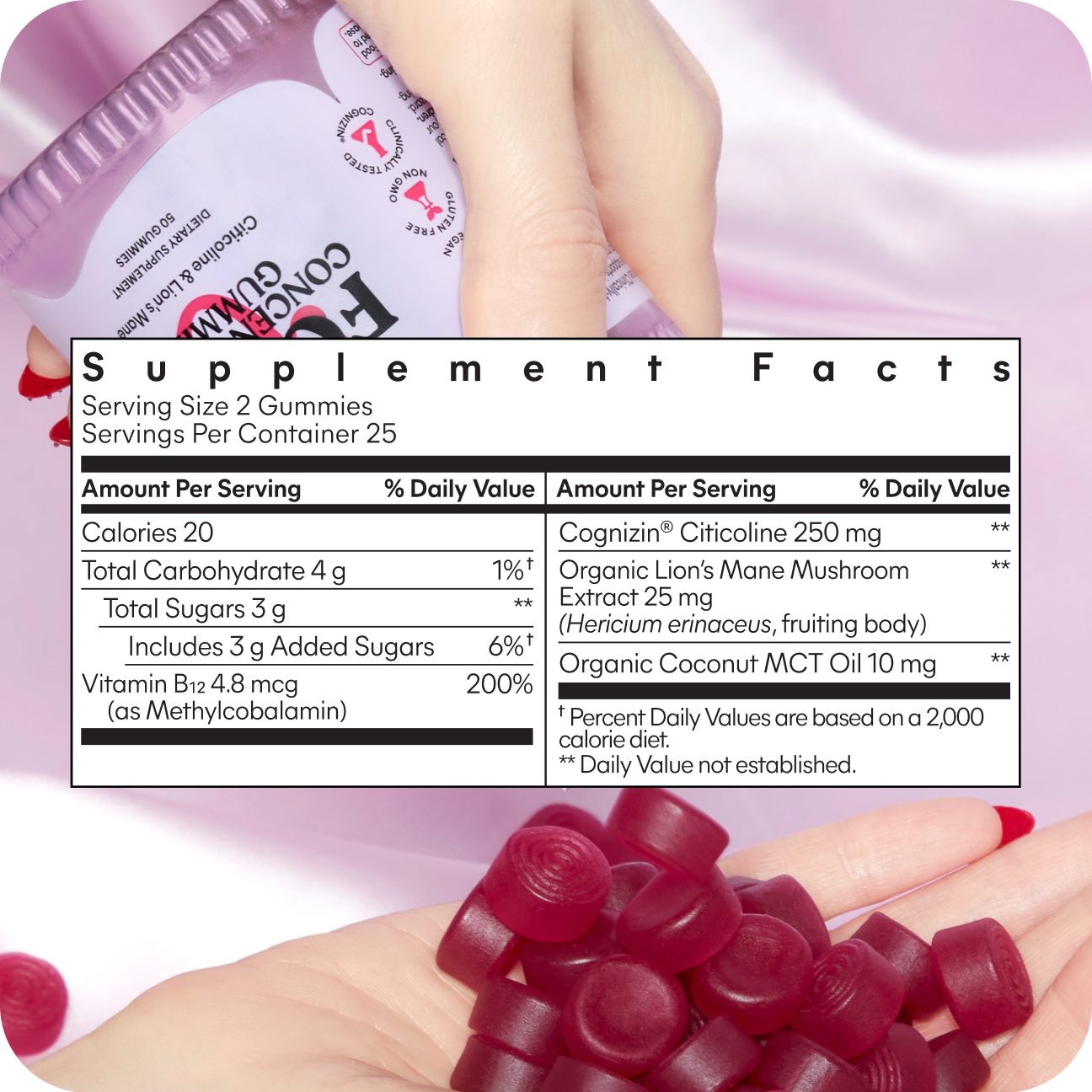 Lemme Focus is formulated with Cognizin® Citicoline, one of the most clinically-studied citicoline ingredients. Cognizin® Citicoline is clinically tested to support focus, concentration and attention. Our focus gummies use a clinical dose of Cognizin® Citicoline. Additionally, Lemme Focus is formulated with Vitamin B12, Organic Lion’s Mane and Organic MCT Oil.*
