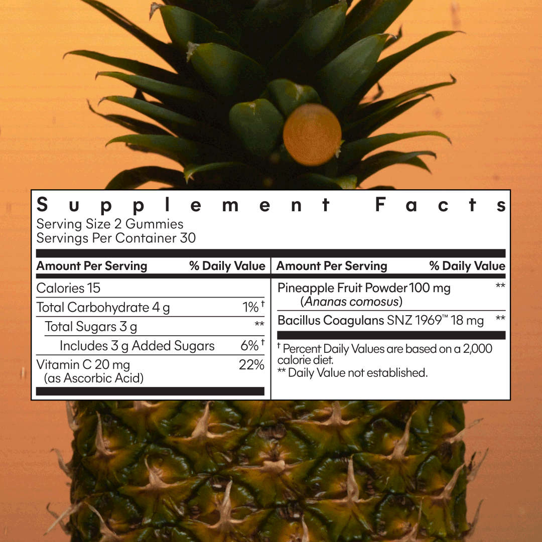 Clinically-studied SNZ 1969™️ probiotics for women support vaginal microbiome health and pH and yeast levels. Plus, we added Vitamin C for antioxidant properties and pro-collagen benefits and real Pineapple extract.*